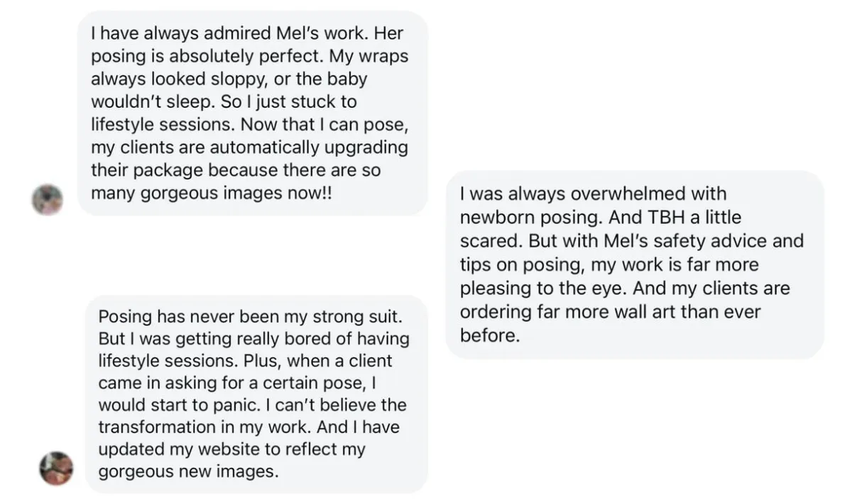 Our program is ideal for photographers who want to exceed client expectations with unique newborn poses, leading to higher satisfaction and repeat business.